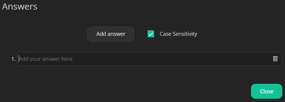 Set correct answers: Select the answer area > click this button on the floating menu > Add answer. Check the Case Sensitivity option if needed.