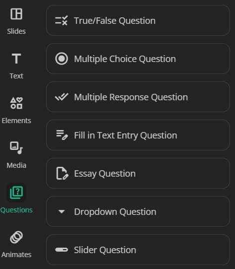 In addition to generating presentation slides using AI, uPresenter stands out from many of its competitors with its interactive quiz creation feature. You can add quizzes to the end of your lecture or create separate online quizzes. uPresenter supports 8 question types including: True/False, Multiple Choice, Multiple Response, Fill in Text Entry, Sequence, Essay, Dropdown, and Slider.