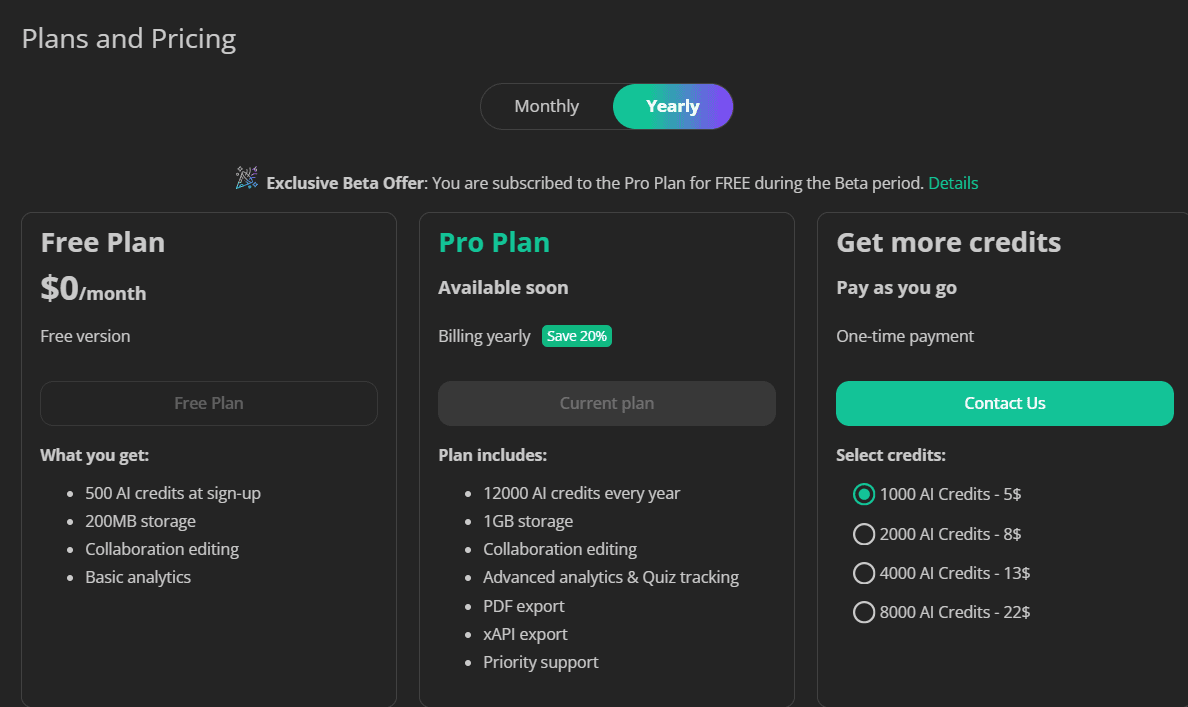 Annual Plan: Includes 12,000 AI credits per year and offers a 20% discount compared to the monthly plan.
