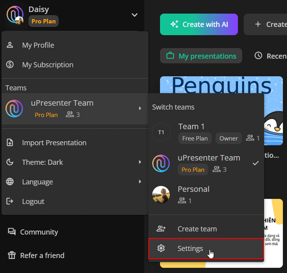 If you're a member of multiple teams, you can easily switch by selecting the desired team from the dropdown list. After selecting a team, the Settings option for that team will become available, allowing you to customize its configuration.
