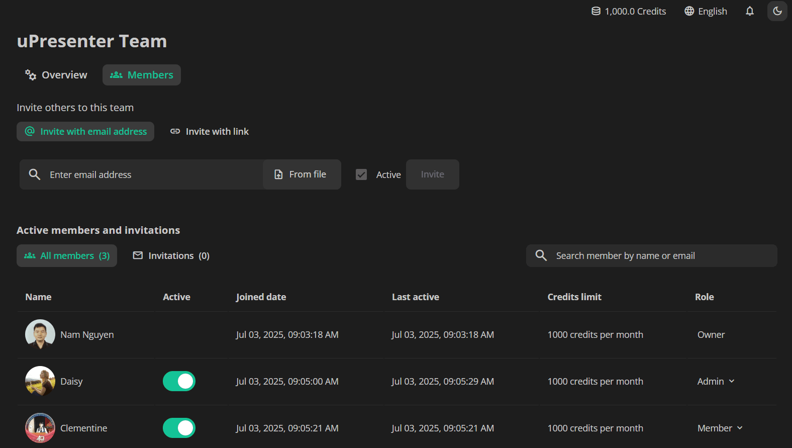 Invite Members: Send invitations via email or upload a Word/Excel list.
